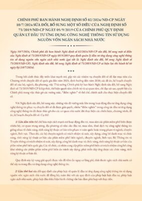 Ngày 10/7/2024, Chính phủ đã ban hành Nghị định số 82/2024/NĐ-CP sửa đổi, bổ sung một số điều của Nghị định số 73/2019/NĐ-CP ngày 05/9/2019 quy định quản lý đầu tư ứng dụng công nghệ thông tin sử dụng nguồn vốn ngân sách nhà nước (gọi tắt là Nghị định sửa đổi, bổ sung Nghị định số 73/2019/NĐ-CP).