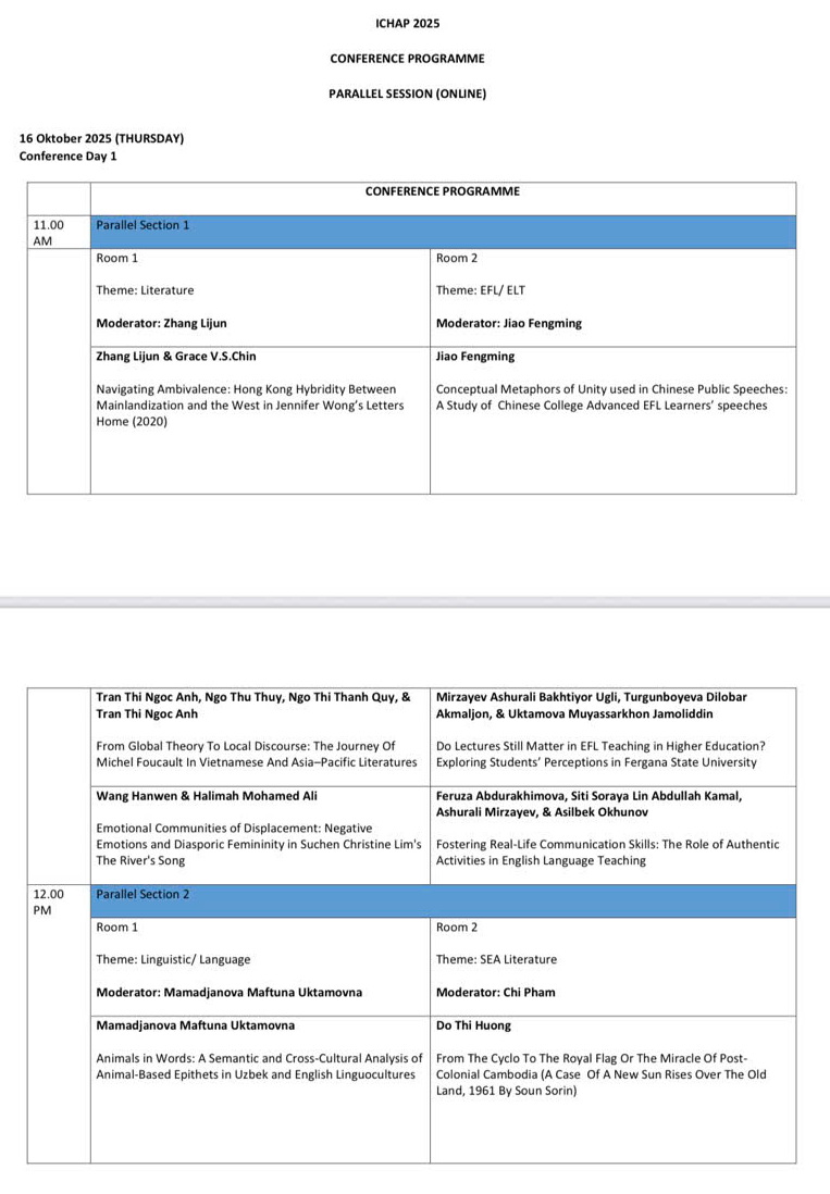 Hội thảo ICHAP là diễn đàn quốc tế thường niên uy tín của USM, quy tụ các học giả, nhà nghiên cứu và giảng viên đến từ nhiều quốc gia châu Á và trên thế giới. Năm 2025, hội thảo diễn ra trong hai ngày (16-17/10/2025). Hội thảo có hai hình thức: trực tiếp và trực tuyến. Phiên trực tuyến gồm bảy phiên thảo luận song song (parallel sessions) bao quát nhiều chủ đề: văn học, ngôn ngữ học, giáo dục, văn hóa, xã hội, môi trường, chính trị và nghệ thuật. Các phiên thảo luận hướng đến việc thúc đẩy trao đổi học thuật quốc tế, mở rộng không gian cho các nghiên cứu mới trong lĩnh vực nhân văn và nghệ thuật đương đại châu Á – Thái Bình Dương.
