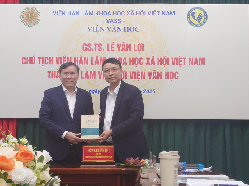 TS. Nguyễn Huy Bỉnh – Bí thư Chi bộ, Phó Viện trưởng phụ trách Viện Văn học trao quà lưu niệm và chào mừng GS.TS. Lê Văn Lợi – Bí thư Đảng ủy, Chủ tịch Viện Hàn lâm Khoa học xã hội Việt Nam và đoàn công tác của Viện Hàn lâm Khoa học xã hội Việt Nam tại buổi làm việc.